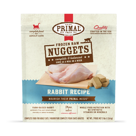 PRIMAL Primal Frozen Raw Nuggets Cat Food Rabbit Recipe $44.99Unit price /Sold outNourish your cat’s primal needs with complete and balanced, easy-to-use Primal Frozen Raw Nuggets. Primal's Rabbit Recipe raw cat food features farm-raised, antibiotic-free rabbit raised without steroids or added hormones. There’s no need to grind, chop, measure, or mix. Simply thaw and serve as a meal or a mixer to...$44.99Unit price /Sold out