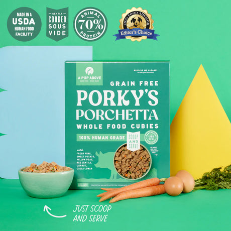 A PUP ABOVE A Pup Above Porky's Porchetta Cubies $29.50Prix unitaire /ÉpuiséThe Cubies are gently cooked sous-vide like our frozen patties then slowly air dried, which preserves nutrients and makes Cubies much less processed than other dry foods, such as kibble. Compared to freeze-dried, Cubies are 50% less in the cost to feed. All in all, you're getting a dry food...$29.50Prix unitaire /Épuisé