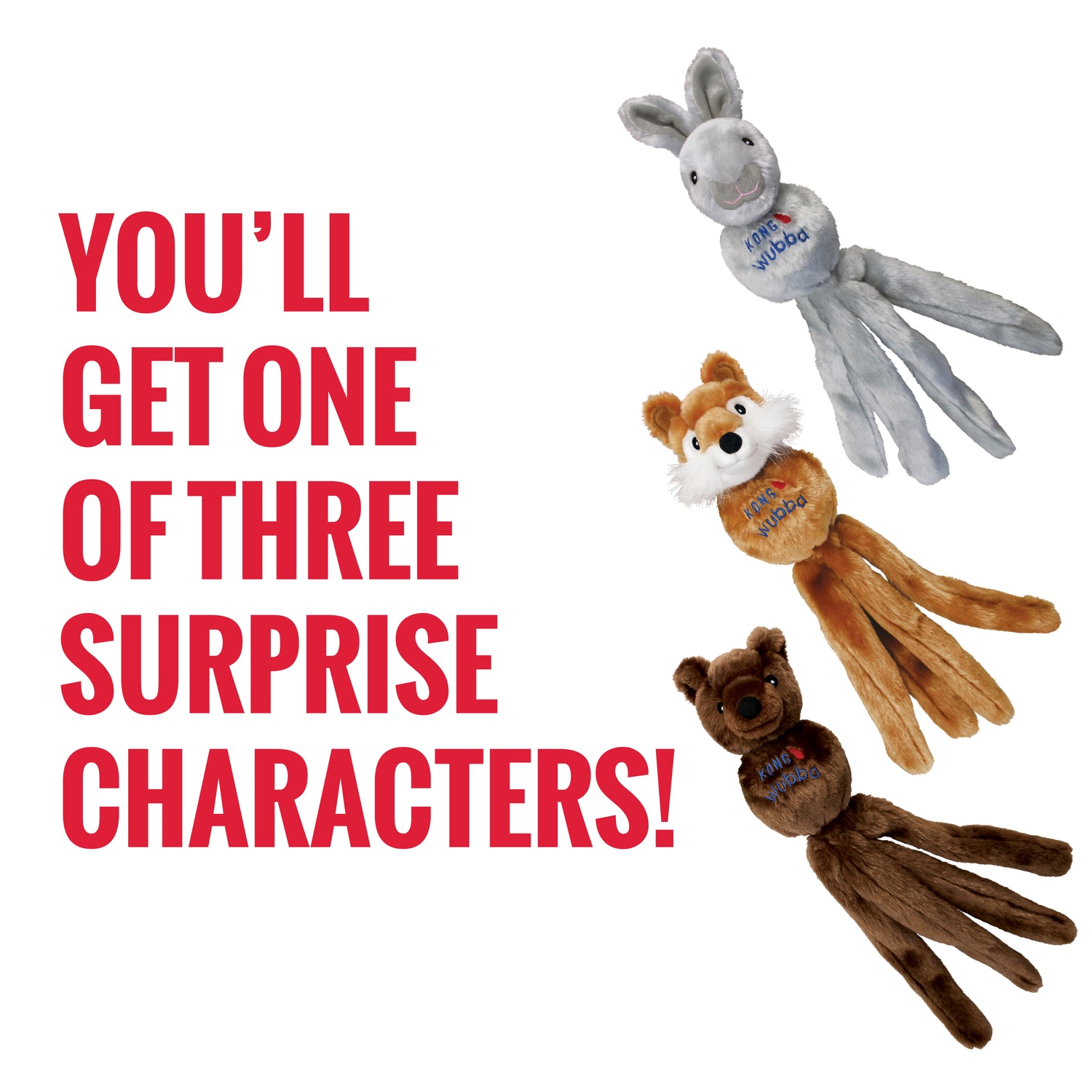 The KONG Wubba Friends are the cutest interactive squeak and shake toys available. These versatile toys are perfect for indoor and outdoor use, and their floppy tails make them easy to pick up and throw. Each toy is covered with soft plush so they are also popular as a nighttime comfort toy. Color will vary.