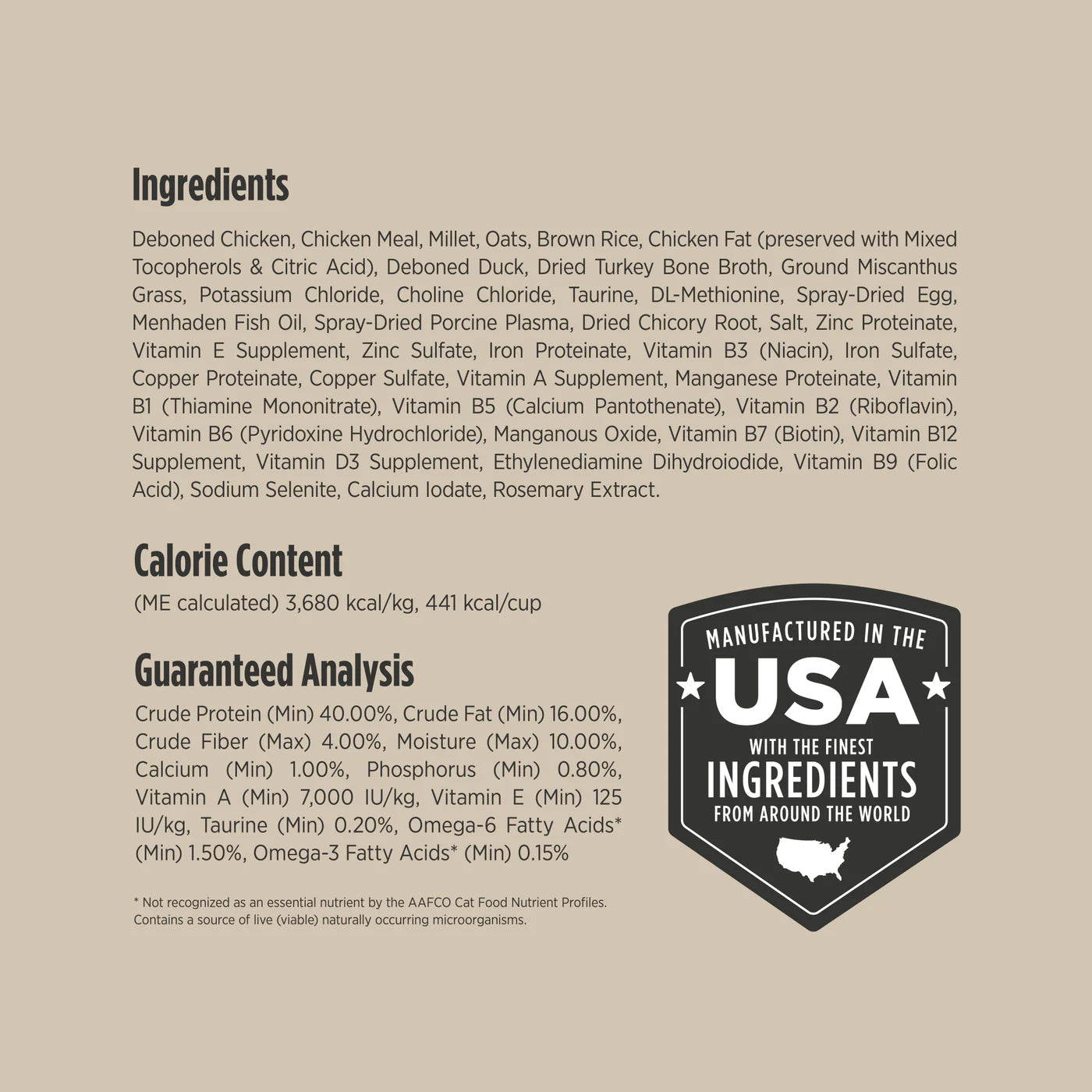 Deboned Chicken, Chicken Meal, Millet, Oats, Brown Rice, Chicken Fat (preserved with Mixed Tocopherols & Citric Acid), Deboned Duck, Dried Turkey Bone Broth, Ground Miscanthus Grass, Potassium Chloride, Choline Chloride, Taurine, DL-Methionine, Spray-Dried Egg, Menhaden Fish Oil, Spray-Dried Porcine Plasma, Dried Chicory Root, Salt, Zinc Proteinate, Vitamin E Supplement, Zinc Sulfate, Iron Proteinate, Vitamin B3 (Niacin), Iron Sulfate, Copper Proteinate, Copper Sulfate, Vitamin A Supplement, Manganese Proteinate, Vitamin B1 (Thiamine Mononitrate), Vitamin B5 (Calcium Pantothenate), Vitamin B2 (Riboflavin), Vitamin B6 (Pyridoxine Hydrochloride), Manganous Oxide, Vitamin B7 (Biotin), Vitamin B12 Supplement, Vitamin D3 Supplement, Ethylenediamine Dihydroiodide, Vitamin B9 (Folic Acid), Sodium Selenite, Calcium Iodate, Rosemary Extract.